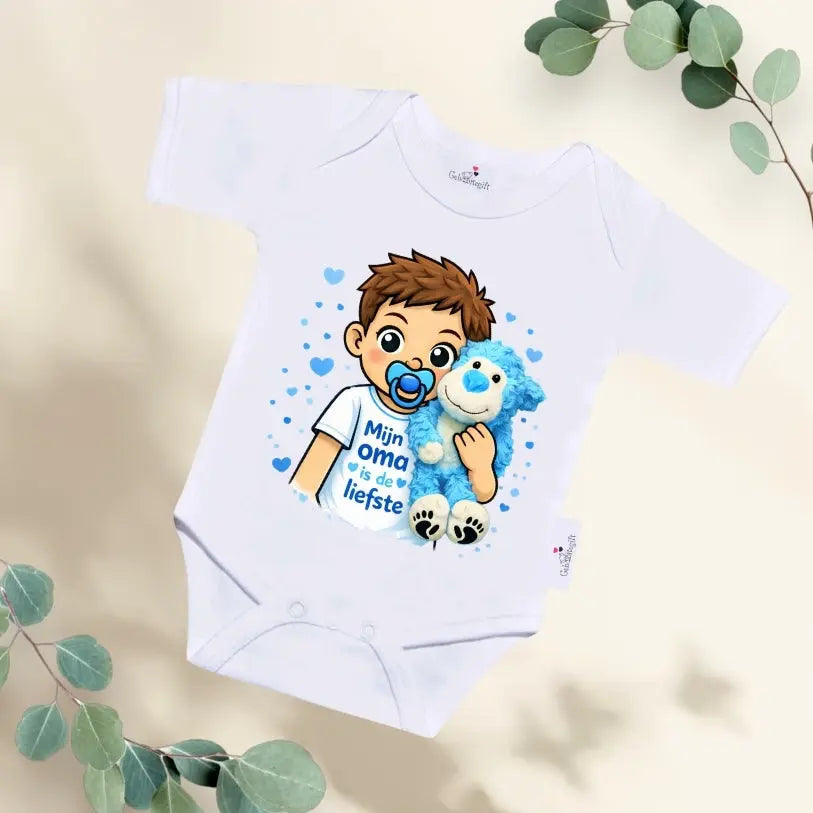 Het Rompertje Jongen met knuffelaapje - Mijn oma is de liefste is een stoer en tegelijk vertederend babyrompertje dat direct warmte en liefde uitstraalt. De schattige illustratie van een jongen met zijn favoriete knuffelaapje en de lieve tekst maken dit rompertje perfect voor kleine jongens die dol zijn op knuffelen. Het is een echte blikvanger en laat meteen zien hoe bijzonder oma is.
