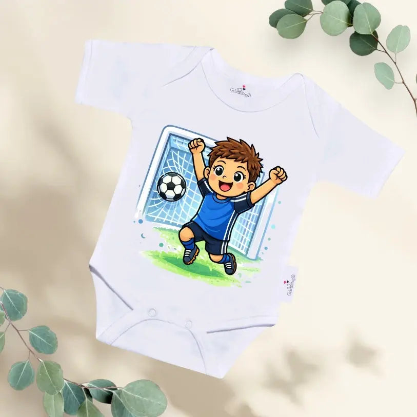 Het Rompertje Voetballer - Jongen is perfect voor kleine kampioenen in de dop. De vrolijke illustratie van een juichende voetballer voor het doel maakt dit rompertje een echte blikvanger. Ideaal voor baby’s van trotse voetbalouders die nu al dromen van mooie doelpunten en grote overwinningen.
