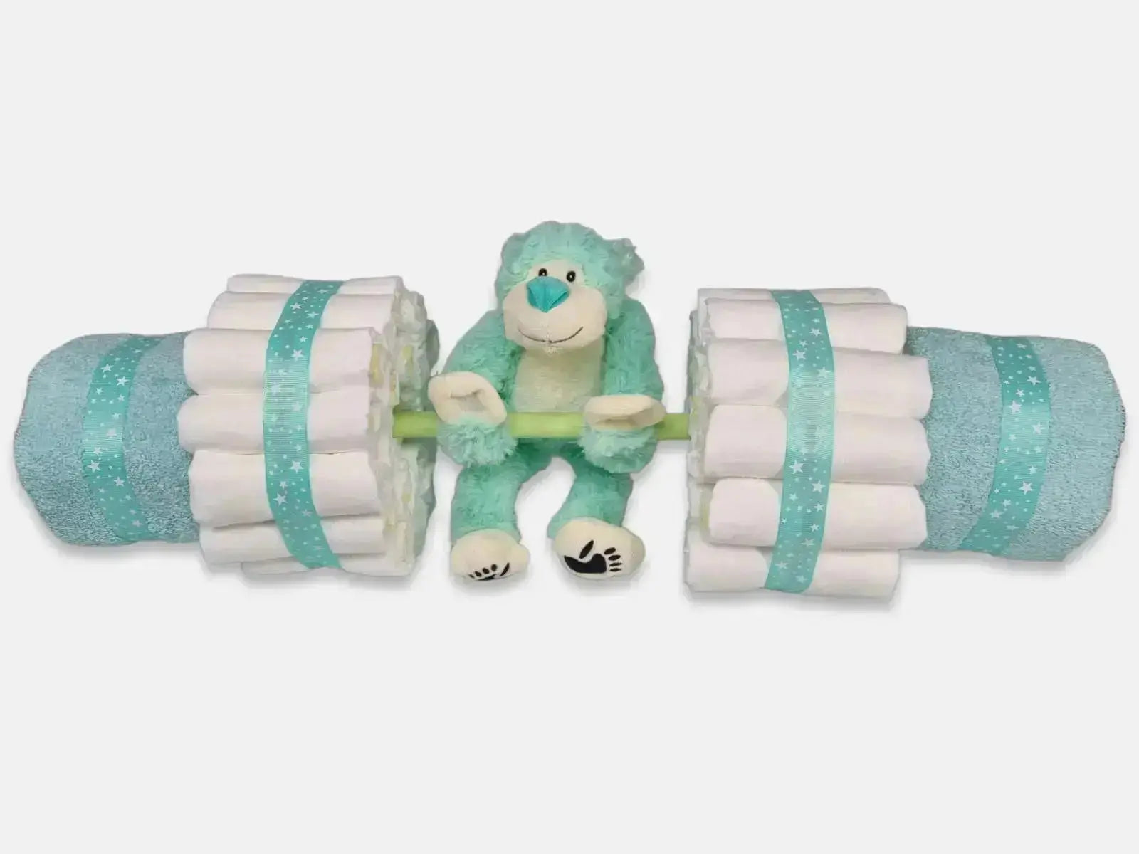 De Aap Bodybuilding Mint Luiertaart is een origineel en vrolijk kraamcadeau met een knipoog naar sportieve ouders. De luiertaart heeft een frisse mintkleur die prachtig past in moderne babykamers, en het stoere thema – met een knuffelaap die z’n spierballen toont – maakt het cadeau extra leuk en opvallend. Ideaal voor ouders met een actieve levensstijl of een goed gevoel voor humor. Natuurlijk is de taart niet alleen leuk, maar ook hartstikke handig!