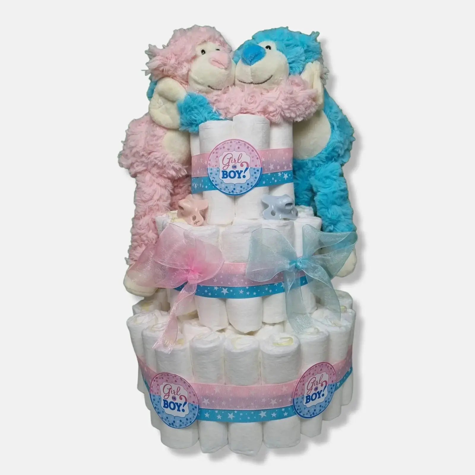 Met deze Babyshower Luiertaart Blauw/Roze geef je een origineel en feestelijk cadeau voor aanstaande ouders die de geslachtsverrassing willen delen! De combinatie van de twee kleuren maakt dit kraamcadeau perfect voor een babyshower of gender reveal. Deze Babyshower Luiertaart Blauw/Roze is gevuld met Pampers luiers en handige babyartikelen die ouders direct kunnen gebruiken. Het bevat onder andere twee schattige knuffelaapjes, die je desgewenst kunt laten bedrukken met de naam van de baby op de buik. Daarnaast bevat de Babyshower Luiertaart Blauw/Roze leuke aankleding met linten en twee Nuby speentjes. De mix van blauw en roze zorgt voor een speelse en feestelijke uitstraling, die perfect past bij de gelegenheid. De Babyshower Luiertaart Blauw/Roze is niet alleen een mooi en praktisch cadeau, maar ook een geweldige manier om de blije gebeurtenis te vieren. Het zal zeker een blijvende indruk achterlaten bij de ouders en gasten.