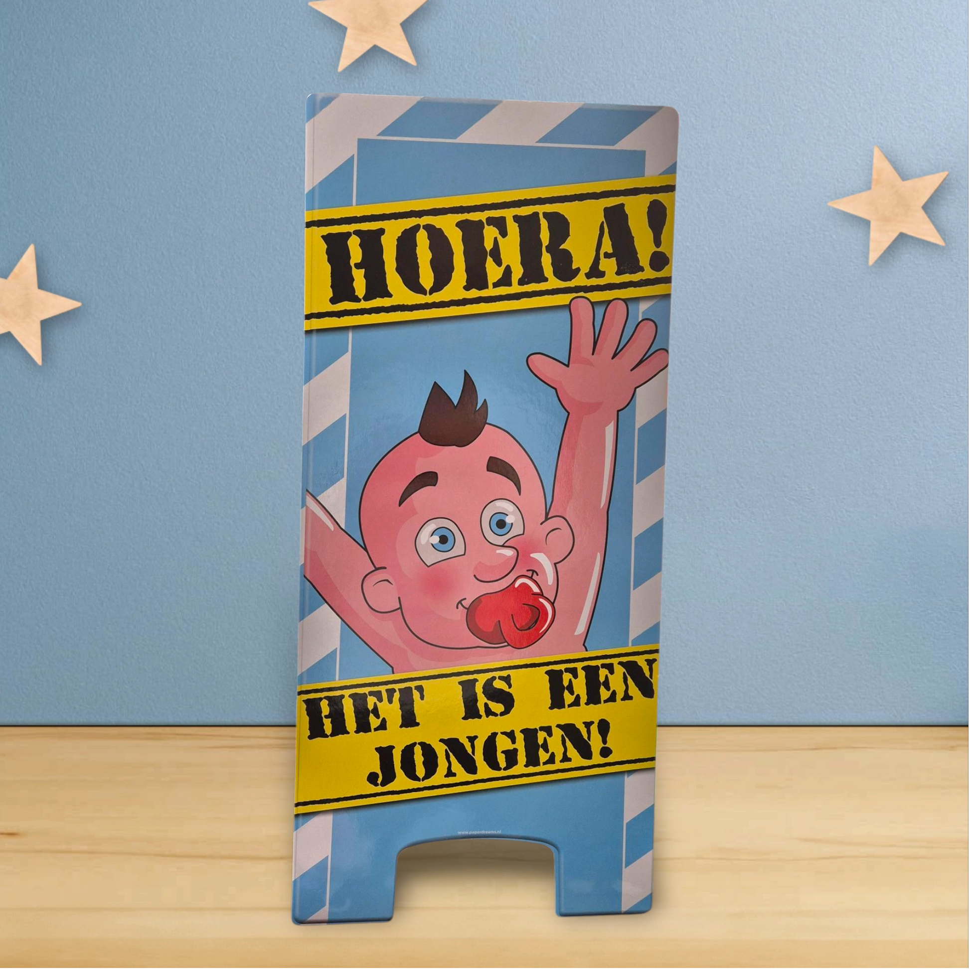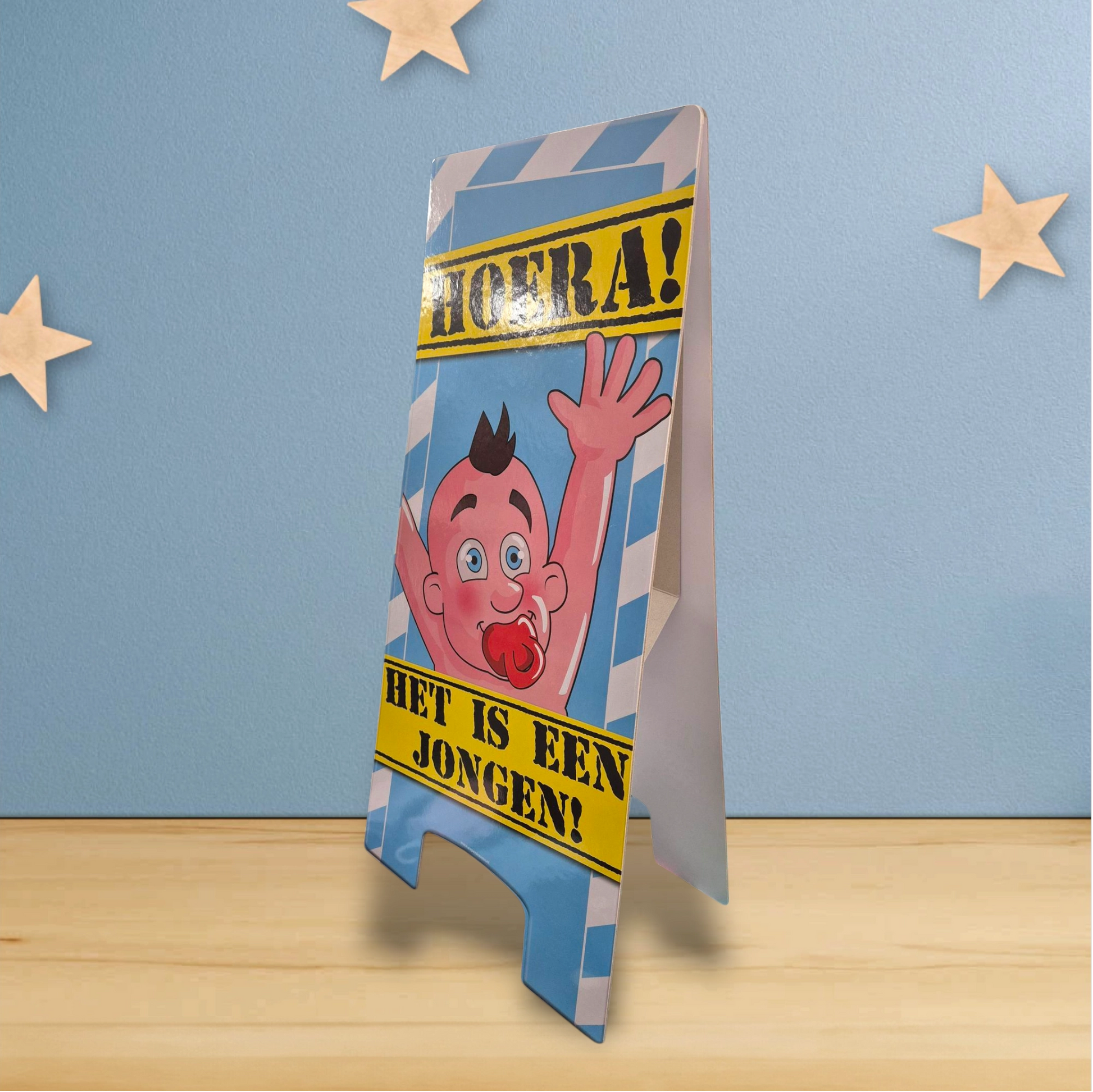 HOERA! Het is een jongen! – geboortebord. Met dit vrolijke geboortebord van 60 cm hoog laat je iedereen weten dat er een jongen is geboren! De stoere kleuren, het speelse ontwerp en de duidelijke tekst maken dit bord dé eyecatcher voor elk raam, tuinpad of feestelijke ruimte.
