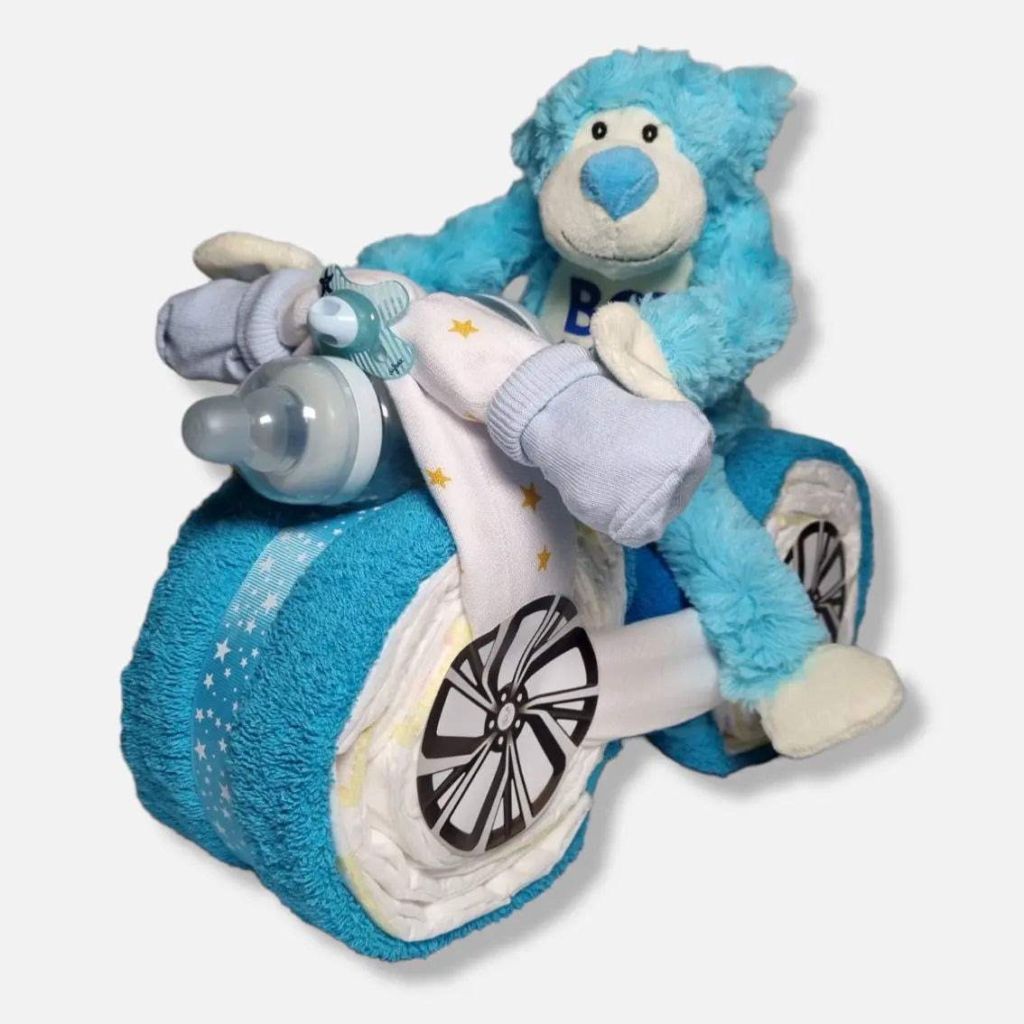Een stoer en praktisch babycadeau! In Scooter Luiertaart Blauw zitten de volgende artikelen: