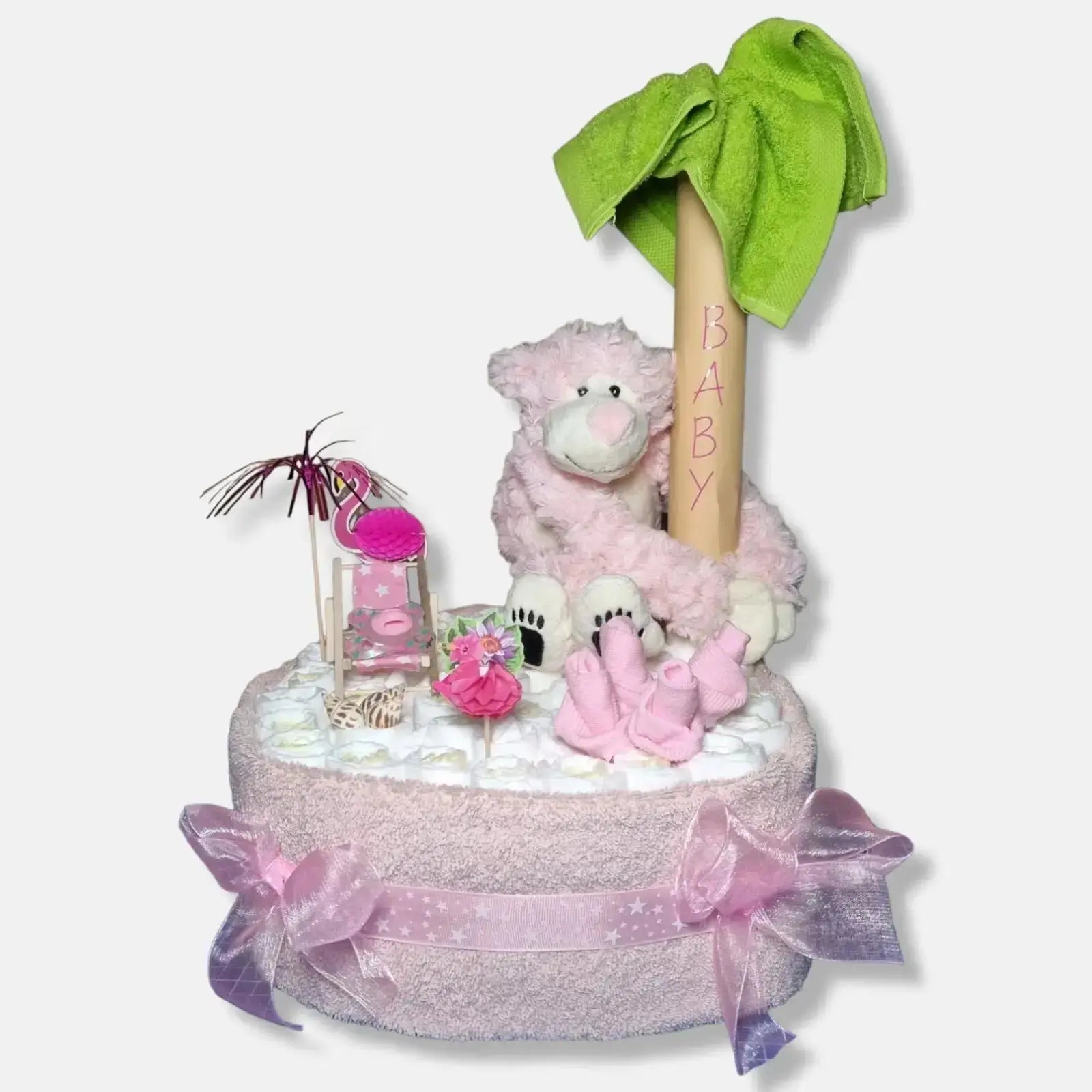 De Tropical Paradise Luiertaart Roze combineert een schattige uitstraling met een exotisch thema! Gevuld met Pampers luiers en tropische accessoires, perfect als kraamcadeau voor een meisje.