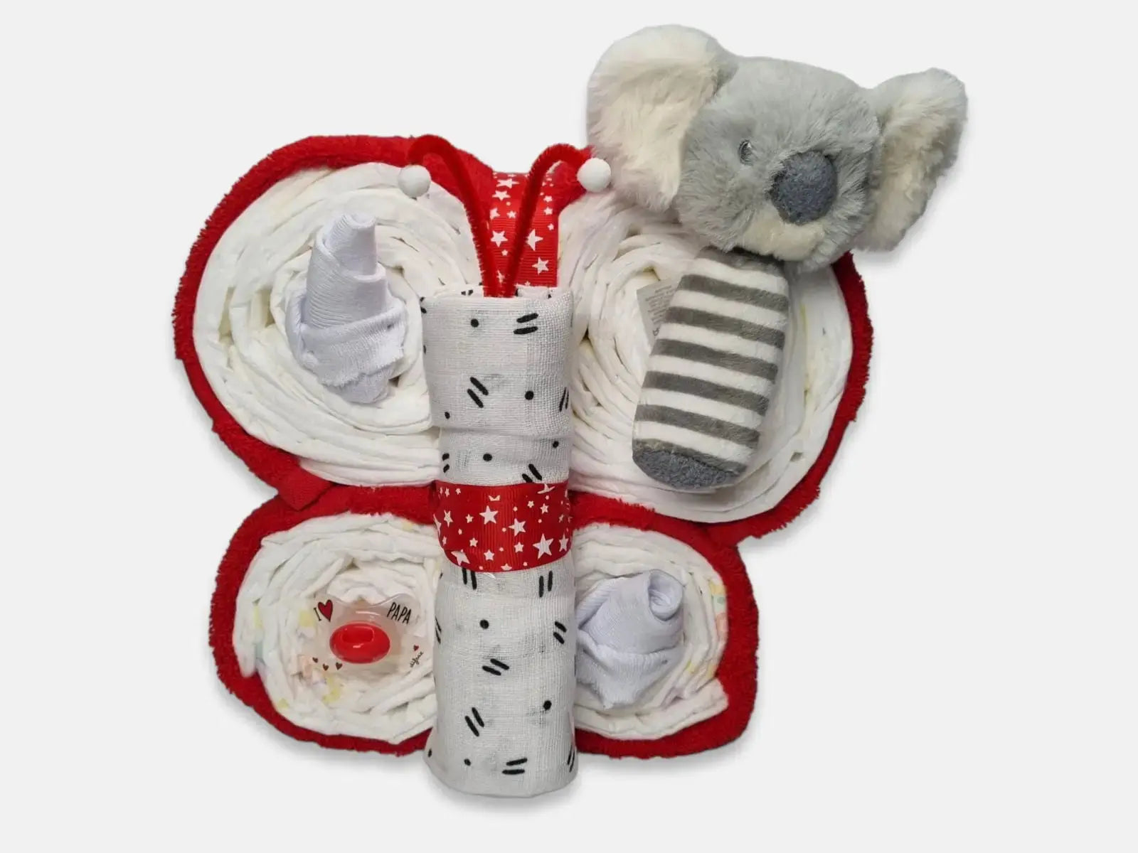 Een opvallend en functioneel kraamcadeau! In Vlinder Rood Luiertaart zitten de volgende artikelen: